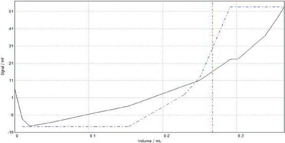Next, a suitable solvent must be chosen in which the sample is soluble and optimal for electrode performance. The sample in this case is a polyether glycol that is soluble in most alcohols. The larger the alkyl chain of the alcohol (to a point), the better the solubility of the polyol. The solubility of this material in methanol is somewhat limited, but ethanol and the propanols are quite good. The cost of obtaining anhydrous ethanol can be a problem, and while both propanol and isopropanol are very good as solvents, their viscosity slows electrode response. The optimal solution is to mix equal volumes of methanol and isopropanol. The isopropanol allows for excellent sample solubility, and the methanol reduces the overall solution viscosity so that the electrode will respond in a reasonable time frame. Some longer-chain polyols will necessitate an extra solubility push for full dissolution of the sample into solution. In these cases, tetrahydrofuran (THF) stabilized with butylated hydroxytoluene (BHT) is an excellent choice. A very easy way to tell if tetrohydrofuran is required is to look at the titration curve in its absence. If the sample is not fully dissolved, the curve will be very flat and demonstrate a very shallow inflection (Figure 2). An immediate addition of THF will solve this solubility issue (Figure 3).