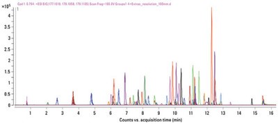 Figure 2 - Increased peak capacity showing the separation of the entire list of U.S. EPA Method 1694 pharmaceuticalsplus 15 new compounds for a total of 90 pharmaceuticals in less than 20 min using a ZORBAX Eclipse Plus-C18, 2.1 mm × 100 mm, 1.8-µm packing material with UHPLC using the Agilent 1290 Infinity LC. Peaks were 5–6 sec wide and peak capacity was 200.