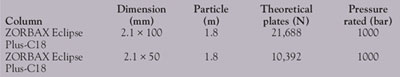 Two different columns were tested for Rapid Resolution High-Throughput (RRHT) analyses, including the high-pressure (1000 bar) 1.8-µm particle sizes. Table 1 lists the columns tested in this work and their theoretical plates.