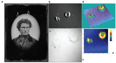 Figure 4 - a) Daguerreotype portrait of unidentified man by studio of Southworth and Hawes, about 1848–50 (×20 objective power, NA: 0.60) (area A shows metallic blisters; area B shows a large exfoliated area); b) blisters obliquely illuminated at 100× magnification; c) blisters in reflected light, brightfield; d) isometric view in gray scale of blisters from confocal 3-D data; e) contour or topographic view in gray scale of blisters from confocal 3-D data.