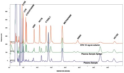 Figure 5 - Typical chromatograms for standards, plasma with standards added, and normal plasma. With the BDD electrode, routine analysis of plasma sample showed no deleterious effects on the signal.