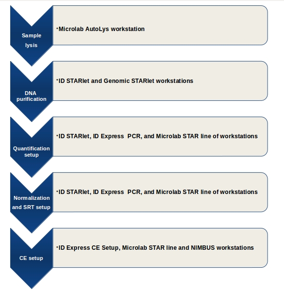 Figure 3 – The casework sample analysis has a set of very clear process steps known to all forensic scientists. A set of automated solutions developed by Hamilton Robotics helps scientists obtain the best-quality results while ensuring the reproducibility and traceability of each step in the process.Most U.S. forensic labs are backlogged and under pressure to guard the chain-of-custody of evidence samples. Automation of liquid handling not only reduces the physical stress of manual pipetting, but also reduces the added stress of protecting public safety. Too often, cases have been dismissed due to lack of reliable evidence. Workstations such as those mentioned here have software and instrumentation that can track the sample’s movement, providing prosecutors with proof that is less likely to be questioned. Hamilton offers a complete automated work flow for analysis of DNA evidence (see Figure 3).