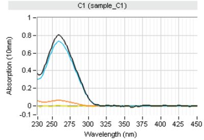 The QIAxpert System software applies state-of-the-art software algorithms that break down the overall measured UV/VIS spectrum and permit accurate determination of the contribution of the molecule of interest to the measured profile versus that of impurities and sample turbidity (Figure 3). This feature allows researchers to combine nucleic acid quantitation with the detection of residual genomic DNA in RNA samples and vice versa, in an easy-to-perform and fast one-step approach. Corrective actions can be taken if needed, that may be critical, for example, when performing real-time PCR (RT-PCR),7,8 where residual gDNA contamination can lead to amplification of both cDNA and gDNA sequences, resulting in false positive real-time PCR signals with lower CT values than true positives.