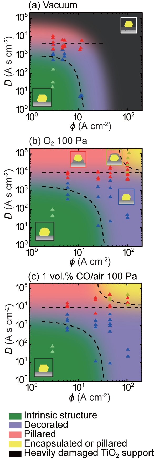 Figure 2 – Structure evolution diagrams of Au/ TiO2 catalysts under electron irradiation as a function of electron current density, f, and dose, D, in a) vacuum, b) O2 (100 Pa), and c) 1 vol% CO in air (100 Pa) at room temperature. The intrinsic structures were observed in the green regions, while gold nanoparticles (GNPs) with decorations and pillars were observed in the blue and red regions, respectively. In the yellow regions, either GNPs with pillars or encapsulated GNPs were observed. A blue, red, or yellow triangle indicates the D at which decoration, pillar, or encapsulation around a GNP was first detected at a given current density. In vacuum, TiO2 supports were heavily damaged, as shown in the black region in (a).2Heterogeneity of real catalysts