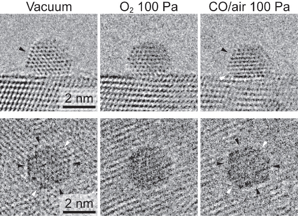 A pressure gap certainly exists between observations made at atmospheric pressure and those made in a conventional high-vacuum TEM. ETEM experiments extend experimental pressures up to 2500 Pa (about 2.5% of atmospheric pressure). With Cs correctors, the Titan ETEM now extends atomic-scale observations above 2000 Pa (Figure 5).4 In practice, gold nanoparticles for carbon monoxide oxidation are used at partial pressures (P(CO)) ranging from 1 to 10 Pa, a range fully covered by ETEM. As for the temperature gap, gold nanoparticle catalysts are highly active even below room temperature. ETEM is also capable of observations at elevated temperatures, as high as 1000 °C with special holders. Therefore, neither a pressure gap nor a temperature gap exists.