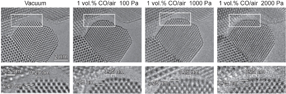 Figure 5 – No pressure gap. The Au{100}-hex reconstructed surface remained stable under CO gas with lower (100 Pa) to higher (2000 Pa) pressures of 1 vol% CO/air (Au/CeO2). The images of the rectangular regions are enlarged and shown at the bottom. The images were recorded using a Cs-corrected ETEM.4 (Reproduced with permission from Ref. 4.)Imaging atoms and molecules during catalytic reactions