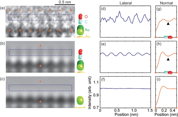 Figure 7 – A glimpse of gas molecules on the surface of catalysts under reaction conditions: a) Observed and b) simulated image of the Au {100}-hex reconstructed structure with CO molecules. c) Simulated image of Au{100}-hex reconstructed structure without CO molecules. Lateral intensity scans of (a), (b), and (c) are shown in (d), (e), and (f), respectively. Line scans normal to the surface of (a), (b), and (c) are shown in (g), (h), and (i), respectively. The oscillation intensity in observation (d) can be accounted for by considering the adsorbed CO molecules, as shown in (e). The Au{100}-hex reconstructed surface without CO molecules could not reproduce the oscillating intensity, as shown in (f). The images were recorded using a Cs-corrected ETEM.4 (Reproduced with permission from Ref. 4.)Conclusion