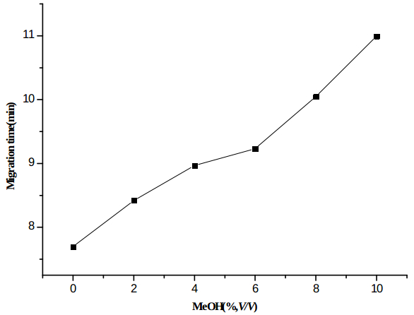 Methanol (0-10% v/v) was added to the background electrolyte as an organic modifier to improve the separation. As shown in Figure 2, the migration time of the analyte increased with the increase in methanol concentration. Furthermore, the analyte was well separated with its neighboring peak behind it in the sample when the methanol content was equal to or higher than 8% v/v. Thus, 8%(v/v) methanol was added to the buffer solution as an organic modifier in subsequent experiments.