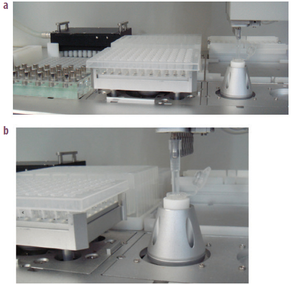 Figure 3 – Automated distribution of the magnetic bead suspension (automated mixing) to the target well of the multiple-well plate for nucleic extraction or purification (n = 3).Library preparation on the VERSA 1100