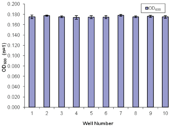 Previous validation studies on installation of the bead mixer on the VERSA 1100 NGS library preparation workstation were encouraging.5 This process, as shown in Figure 1, was validated for distribution of the magnetic beads prior to its application for AMPure XP beads for NGS library preparation. Figure 2 shows a standard curve that was generated with the OD600 values from a spectrophotometer obtained with manually mixed bead suspensions. The bead concentrations delivered by the VERSA liquid handling workstation were uniform, consistent and reproducible (Figure 3).