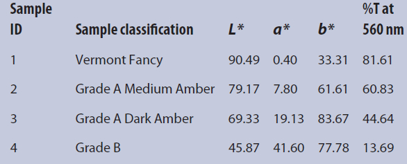 Under the new classification system, terms such as “Golden,” “Amber” and “Dark” are used to name the maple syrup. By visually inspecting the samples, the colors range from light yellow to a reddish brown between Vermont Fancy and Grade B. As previously discussed, positive a* values indicate a more red component in the overall color determination, along with a positive b* value, which corresponds with a more yellow sample. “Amber” is a yellowish-orange color halfway between yellow and orange on the color wheel. Thus, the values for a* and b* increase, going from Vermont Fancy to Medium Amber and Dark Amber, as expected.