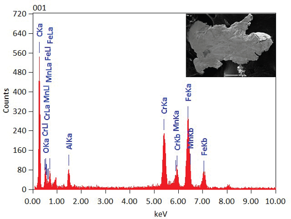 Figure 8 – Secondary electron image (inset) and EDS spectrum of foreign particle from parenteral drug.