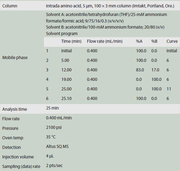 As shown in Table 4, limit of detection (LOD) and limit of quantitation (LOQ) levels were established for each analyte, based on a signal-to-noise (S/N) of >3/1 for the LOD and >10/1 for the LOQ. The considerably higher values for alanine are due to its lower ionization efficiency.