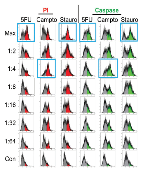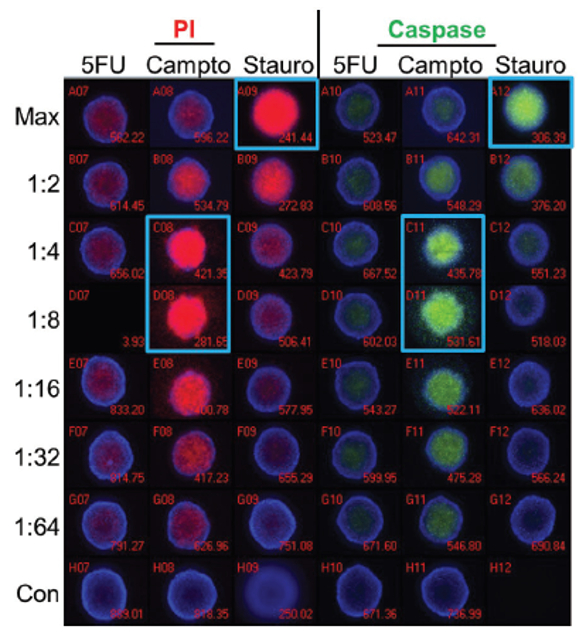 Figure 3 – Spheroids created using hanging drops were treated with 5-fluorouracil (5FU), camptothecin (Campto), and staurosporine (Stauro) at the indicated dilutions for 24 hours, and stained for apoptosis markers for analysis by imaging. Control spheroids (Con) were treated with DMSO alone. Wells with maximal staining by propidium iodide (PI) or activated caspase substrate are identified by blue boxes. Staurosporine shows a traditional dose response while the highest level of staining was seen at the 1:4–1:8 dilutions of camptothecin. 5-Fluorouracil treatment resulted in no significant staining of spheroids.
