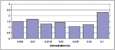 2. Quantification of menthol in mouthwash. The calibration model in Figure 4 shows an important linearity: R2 = 0.999 from 0.005% to 0.1% w/v, and a very low limit of detection of menthol: 0.1 ppm in liquid phase. Thus, the instrument permits the reliable quantification of compounds such as menthol at low concentrations in personal-care products.