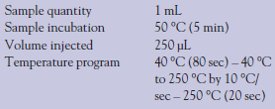 In the first step, a reference mouthwash representing good quality (as defined by the manufacturer based on human assessment) was analyzed with the HERACLES Electronic Nose in order to build a quality control model. Next, blind samples were analyzed in order to assess their quality and whether to accept or reject products. In a second step, seven solutions containing various amounts of menthol were analyzed. The objective was to set up a calibration model that allowed the quantification of menthol in new samples. Analytical conditions are shown in Table 2.