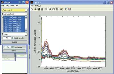 Much of the functionality of the PLS_Toolbox cluster analysis tool was preserved, although some preprocessing, plots, and other functionality was removed relative to the standalone Solo™ data-analsis product of Eigenvector Research. Further improvements were made to the searching, sorting, and copying operations—a new database was created to store all the spectra file records collected during development, along with a better understanding of how to generate array basic programs using GRAMS/AI.