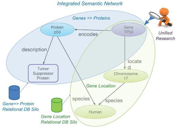 RS: ST employs universally descriptive subject-predicate-object “triples” (e.g., “gene-expresses-protein” is a triple) to define data relationships. In contrast to the rigidity and obscurity of RDB tables, using triples as basic assertions to link data facilitates agile and meaningful integration. Triples combine to create rich, domain-specific data models or ontologies (see Figure 1).