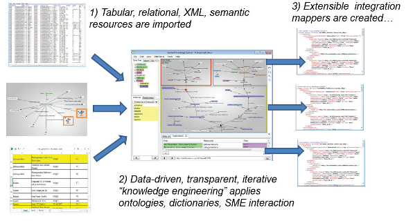 Figure 2 – Extraction and transformation parts of ETL. 1) Data from structured files or text mining output (upper left), semantic resources (left center) and databases (bottom left) are identified and imported. These are transformed into stores of linked data or “triples,” which enables 2) data harmonization and integration with the aid of lexical matching, domain-specific ontologies and inference made possible by the semantic data modeling and visualization tool (“Knowledge Explorer” center). 3) This advanced visual query and inference engine generates data harmonization and integration rules (right) and can also be directly applied to explore the integrated data for research and discovery. The integrated data is prepared for delivery to third-party tools and can also be searched with advanced semantic query languages such as SPARQL.