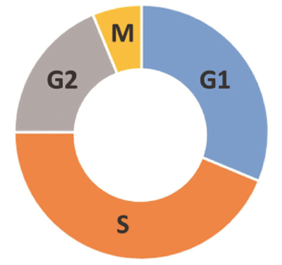 Figure 1 – Phases of the cell cycle. G1 is the first growth phase, G2 is the second growth phase, S is the synthesis phase, and M is the mitosis phase where the cells divide in half. Serum growth medium of the cells was washed away, which arrests cells at the G1 phase in the cell cycle. The control group for each line was cells with normal serum growth medium (not starved). Cisplatin was added and the uptake kinetics were recorded. The mean intensity of Pt was measured with the Single Cell ICP-MS system. No significant difference in the rate of uptake of platinum was observed, indicating that the reason for the different uptake is not related to the cell cycle. (Figure reproduced from Ref. 1).RLS: ICPs have a reputation for measuring many metals very rapidly and with excellent detection limits. For single-cell analysis, which ones are most interesting—Na, Ca, Cu, Zn, Fe, Al …?