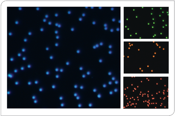 StarLight Calibration Slides from Bangs Laboratories, Inc. (Figure 18) feature vibrant ~6 μm fluorescent microspheres for basic imaging checks and calibration. Four standard versions are each dyed with a single fluorophore and are appropriate for use with common microscope filter sets: Glacial Blue (360, 450), Dragon Green (480, 520), Envy Green (525, 565) and Flash Red (660, 690). The calibration slides are available individually or as the full 4-slide collection.