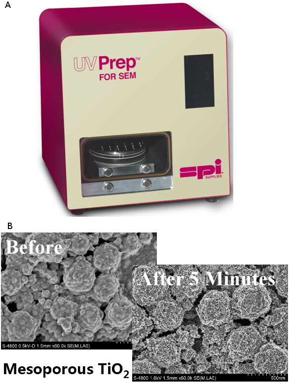 Figure 2 ‒ A) SPI’s compact UV Prep SEM sample cleaner. B) Visible reduction in hydrocarbon martial obscuring the pores in a sample of mesoporous TiO2 (5-minute UV cleaning time).