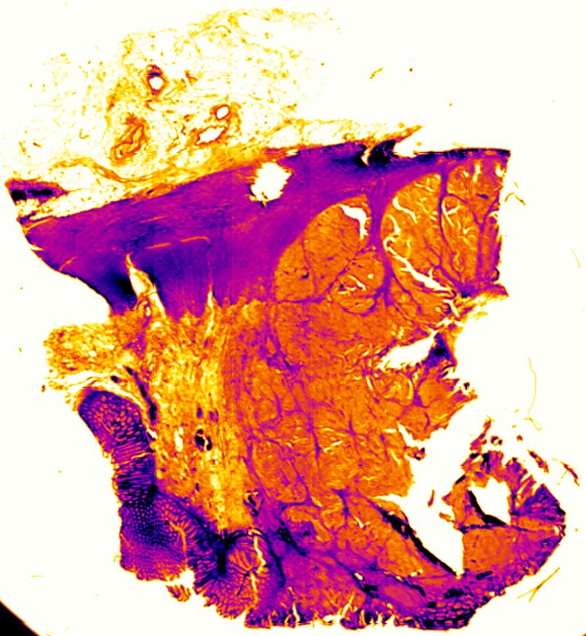 Figure 9 ‒ Transmission image of 8-μm section of human colon tissue on CaF2 substrate (12.5 × magnification). The entire 2 cm × 2 cm sample was imaged in less than 3 minutes. The image was collected using discrete frequency laser illumination at 1656 cm-1 , showing the relative absorption associated with the Amide I protein peak.Diamond ATR Handles Extremely Hard Samples