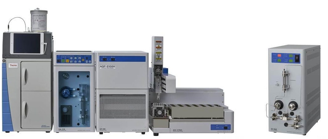 First, our AQF-2100H Combustion Ion Chromatography (CIC) system with the new ASC-270LS Autosampler, GI-260 Automatic LPG Injector and ES-211 External Solution Selector Valve. With the ASC-270LS one can easily change from solid to liquid samples by simply replacing the sample tray and head. The GI-260 introduces multiple LPG sample injections automatically, enabling calibration of the CIC with a single LPG Standard. The ES-211 further expands the AQF-200H’s power by automatically calibrating the Ion Chromatograph directly with up to 6 aqueous standards. These options make the AQF-2100H a powerful, flexible and easy to use analyzer.