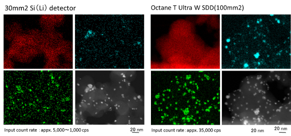 Figure 4 – Comparison of a 30-mm2 Si(Li) detector to EDAX’s new Octane T Ultra W SDD (100 mm2).FEI suite of solutions includes SEM, TEM, dual beam, and VSG software