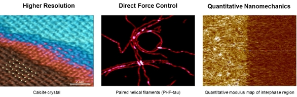 Figure 9 – Results from Bruker’s new PeakForce Tapping. Left: Single-point atomic resolution. Center: low imaging forces. Right: real-time quantitative modulus mapping.Spectroscopy