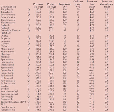 Due to the diversity of pesticides used in food protection and the globalization of the food industry, it is important to monitor programs that cover a large number of pesticides. The application of ultrahigh-performance liquid chromatography (UHPLC) systems combined with the new generation of triple-quadrupole mass spectrometers facilitates the analysis of pesticides in challenging matrices such as food samples. As a result of the high sensitivity and high-scan-rate capabilities of the Agilent 6460A triple-quadrupole mass spectrometer (Agilent Technologies, Santa Clara, CA), the simultaneous qualitative and quantitative multiresidue analysis of a large set of pesticides at trace levels can be performed.