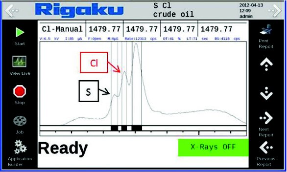 However, because of the high prices of crude oil and the need for the most efficient refining, the possible presence of chlorine in crude oils has become a concern in the industry. Chlorine may occur naturally at low levels in crude, but can also be introduced at higher levels by sea water in crudes from off-shore drilling, in solvents used in the refining process, and even through unwanted adulteration of crudes. Left undetected, the presence of chlorine has the potential to bias a sulfur measurement, resulting in an unreliable sulfur result. Modern low-cost EDXRF systems using a silicon semiconductor detector have the ability to distinguish the sulfur and chlorine measurements peaks, affording a corrected sulfur result. The chlorine concentration may also be simultaneously determined, if needed. The spectra shown in Figures 1 and 2 illustrate this idea. Detection and correction for the presence of chlorine are critical to many refining operations.
