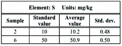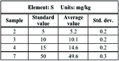 ISO 13032 is a new standard test method published in April 2012 that incorporates performance-based criteria requiring a system to meet thresholds for signal-to-background and precision. Benchtop EDXRF systems using direct excitation and a silicon semiconductor detector can meet these criteria and can be used for reliable measurement of sulfur down to 8 mg/kg as described in the scope in the method. Table 2 shows typical precision results using the Rigaku NEX QC+ EDXRF analyzer equipped with a silicon drift detector (SDD). A sulfur detection limit on the order of 1 mg/kg can be obtained, depending on measurement time used.