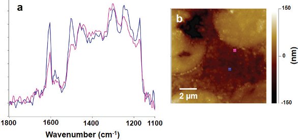 Figure 4 – Overlay of two selected AFM-IR spectra (a) extracted from Figure 3 recorded at the locations indicated in the epoxy region of the AFM image (b). The differences in the IR spectra suggest the chemical nature of the epoxy is different close to the carbon fiber than it is farther away.