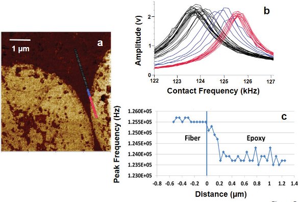 Figure 5 – Lorentz contact resonance image (a) of two carbon fibers in the epoxy matrix showing contrast based on mechanic stiffness. Locations where the mechanical response spectra (b) were collected along a line with 50-nm spacing are shown on the image. The black contact resonance mechanical spectra were recorded in the epoxy region, the red spectra in the carbon fiber region, and the blue spectra in the interphase region. The corresponding contact resonance peak frequency is plotted as a function of distance from the boundary between the carbon fiber and epoxy matrix (c).Figure 5 shows a mechanical stiffness LCR9 image of two carbon fibers in the epoxy matrix. The contrast in the image is based on mechanic stiffness differences, with the carbon fiber having a higher peak contact resonance frequency corresponding to higher stiffness. Locations where individual mechanical response spectra were collected along a line with 50-nm spacing are shown on the image. The black contact resonance mechanical spectra were recorded in the epoxy region, the red spectra in the carbon fiber region, and the blue spectra in the interphase region. The contact resonance peak frequency plotted as a function of distance from the boundary between the carbon fiber and epoxy matrix clearly shows there is a gradient of mechanical stiffness in the interphase region of the epoxy. This result is consistent with the AFM-IR spectral results shown in Figures 3 and 4, where the IR spectra in the interphase region are also clearly different.