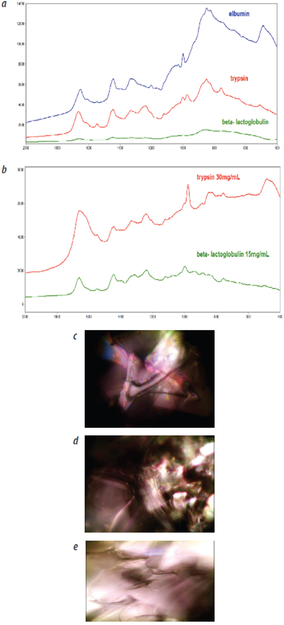 Figure 3 – Portable Raman microscope analysis of a protein. a) Spectrum of the protein as a solid. b) Spectrum of the protein in solution. (c-e) Watching the crystallization process under the microscope. All analyses were conducted on the μ-BioRaman.Bacteria, metabolic and cancer analysis