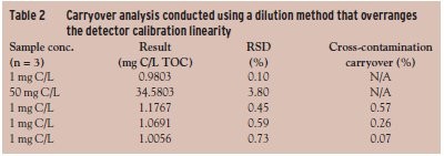 In the final experiment, the major aspect of the carryover calculation is the effect of the 50-mg C/L sample on the low-level samples. Although the 50-mg C/L sample is beyond the linearity of the calibration curve by fivefold, the Fusion again demonstrates its ability to rinse the sample pathway in between analyses. Carryover is less than 1% immediately following the out-of-linear-range sample, and the two samples subsequently show less than 0.1% carryover (Table 2).5,6